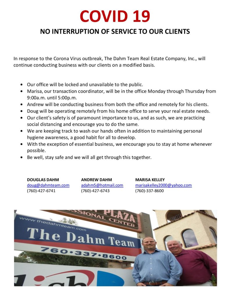 We will continue to help you with your real estate needs. In response to the Corona Virus outbreak,The Dahm Team Real Estate Company, Inc., will continue conducting business with our clients on a modified basis.Below is a list of our Covid-19 policies and procedures.
